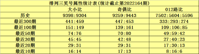 开奖回顾:排列三第2022164期开出奖号189,号码012路比1:1:1、大小比2:1、奇偶比为2:1。