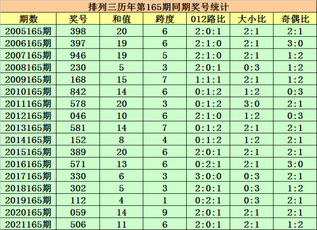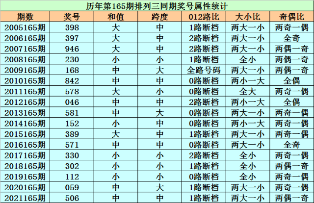 历史上第2022165期排列三已开出17期奖号了,历年同期奖号分别为:398、397、946、230、168、842、578、046、581、152、389、571、330、302、112、059、506,详细统计见下表: