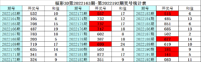 上期回顾:福彩3D第2022192期奖号为:083,其中奖号组选类型为:组六,奇偶比为1:2,大小比为1:2,012路比为2:0:1,和值为11,跨度为8。