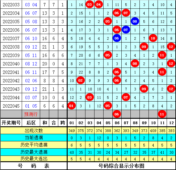 本期后区注意四码01、06、10、11,单挑两码06、11。