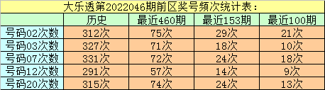 万妙仙大乐透第2022046期前区热号分析:(统计最近460期数据)