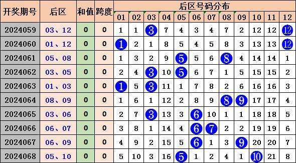 后区冷热分析(最近5期未开出的号码为冷号):上期大乐透后区开出热冷号码05 10,近十期开出冷冷形态0次,冷热形态0次,热冷形态5次,热热形态5次。本期推荐热热形态开出,本期推荐5码:01 03 05 09 10,精选号码01 03。