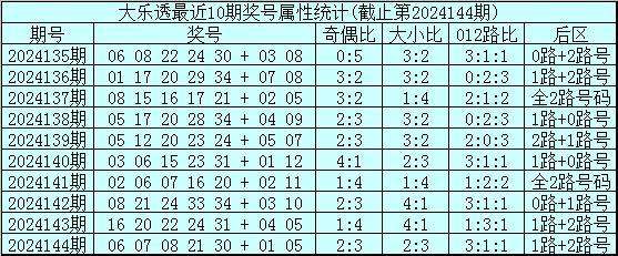 大乐透第2024144期开奖号码:06 07 08 21 30 + 01 05。前区奖号大小比为2:3,奇偶比为2:3,012路比为3:1:1,后区为1路+2路号。