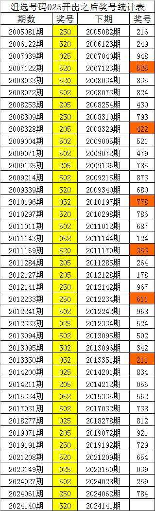 体彩排列三组选号码025历史上出现了40次,其下期奖号分别为:216、249、948、525、835、824、430、793、422、521、479、785、873、680、778、786、687、124、353、264、178、967、611、968、524、502、342、211、834、056、562、738、812、921、729、654、039、259、784,详细统计见下表: