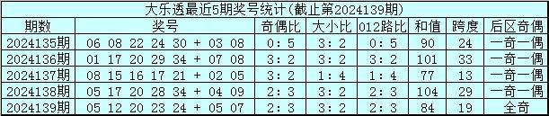 体彩大乐透第24139期奖号为:05 12 20 23 24+05 07,前区奇偶比为2:3,大小比为3:2,012路比为2:0:3,和值为84,跨度为19,后区为全奇组合。