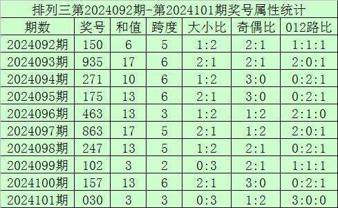 上期回顾:排列三第2024101期开奖号:030,奖号和值:3,奇偶比1:2,大小比0:3。