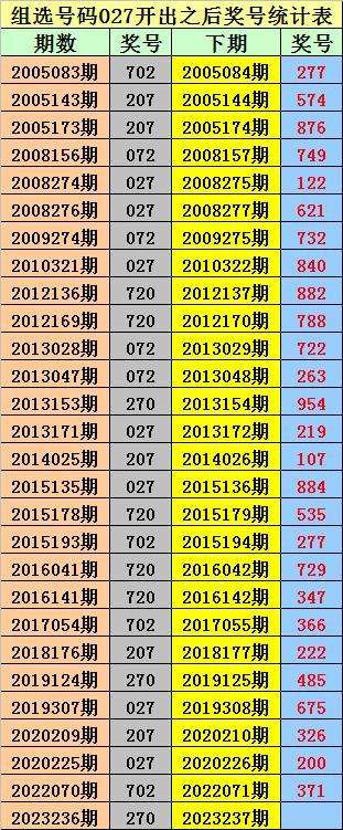 排列三组选027出现之后下期分别开出:277、574、876、749、122、621、732、840、882、788、722、263、954、219、107、884、535、277、729、347、366、222、485、675、326、200、371。