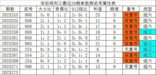 体彩排列三最近20期单数期奖号分别为:986、056、908、088、930、993、224、554、234、096,各期奖号详细属性下表: