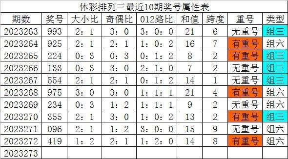 体彩排列三最近10期分别开出奖号:993、925、224、133、554、975、234、355、096、419,各奖号属性详见下表: