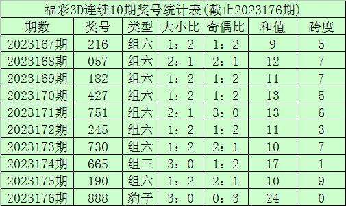 开奖回顾:福利彩票3D第23176期奖号开出888。奖号类型为豹子,奇偶形态为偶偶偶,大小形态为大大大。