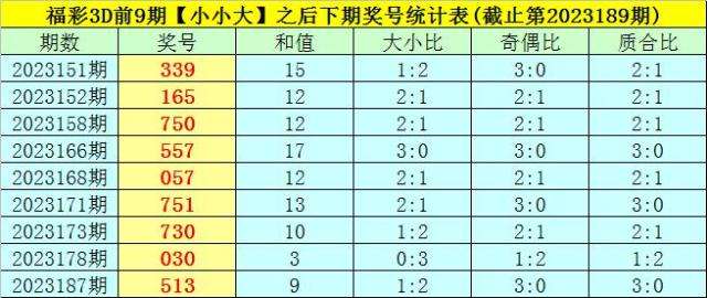 一、上期回顾:福彩3D第2023189期奖号为:327,奖号类型开出组六,大小比为1:2,奇偶比为2:1,和值为12,跨度为5,012路比为1:1:1。