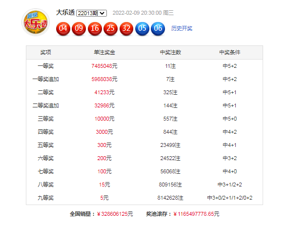 大乐透第22013期开奖,当期开奖号码为:前区04 09 16 25 32,后区05 06。当期前区号码大小比为2:3,奇偶比为2:3,三区比2:1:2,前区没有开出重号和连号;后区开出小小组合05 06。