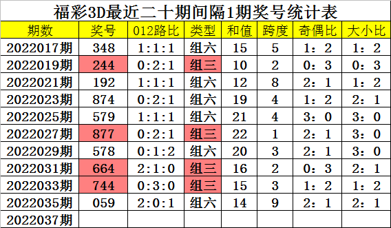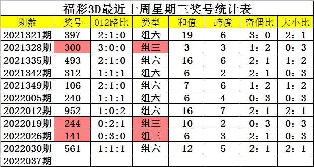 奖号类型分析:从近期周三开奖数据分析,组六近期热出,十周内出现7次,上周三为组六号码,组三出现3次,表现相对较冷,本周三预计继续开出组六号码。