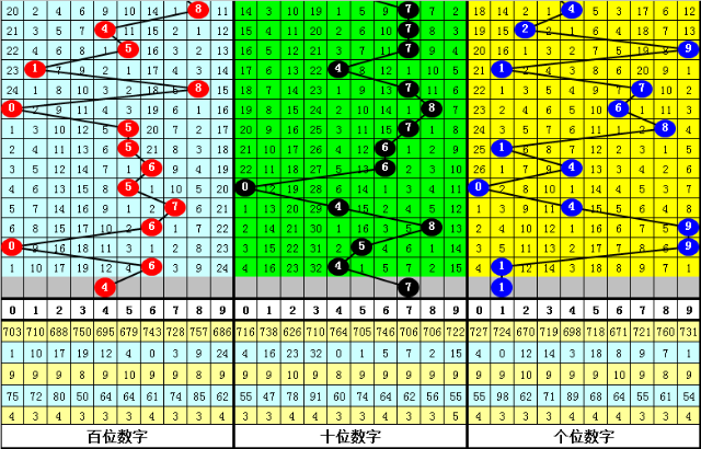 跨度分析:最近周三跨度出现范围在2-7区间,跨度比较集中,上周三跨度为5,跨度上升了2个点位,本期看好跨度上升,参考跨度6。