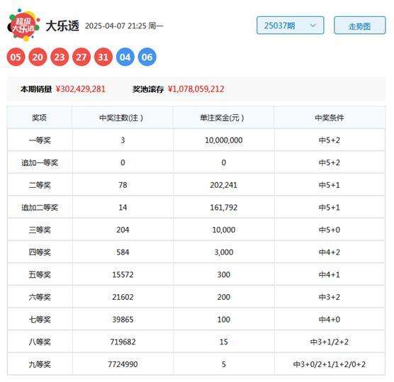 上期开奖:体彩大乐透第2025037期开奖号码为:05 20 23 27 31 + 04 06。