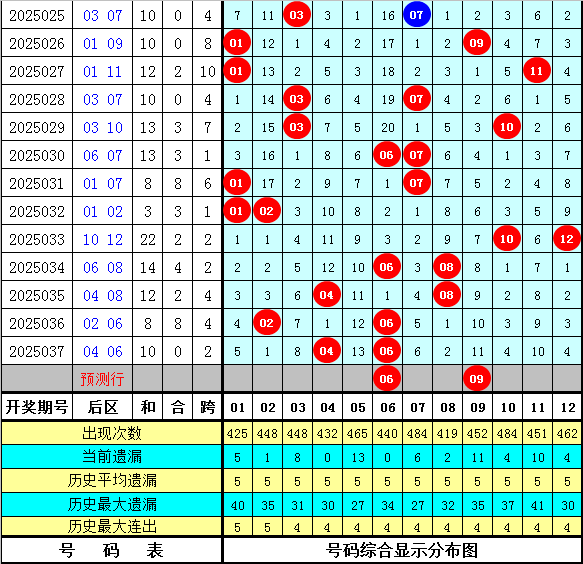 和值跨度:上期和值开出106,对比第2025036期和值上升了25个点位,本期预计和值在大号区域热出,看好出现在93周围。