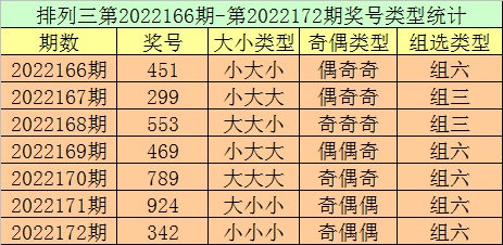 排列三第2022172期回顾:奖号342,奇偶比1:2,大小比0:3,和值9,类型:组六。