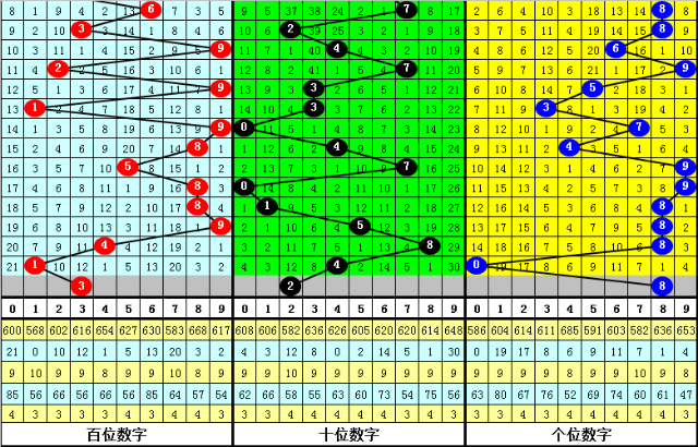 其中,号码0-9开出次数分别为:号码0开出3次、1开出3次、2开出0次、3开出3次、4开出4次、5开出3次、6开出0次、7开出2次、8开出7次、9开出5次。