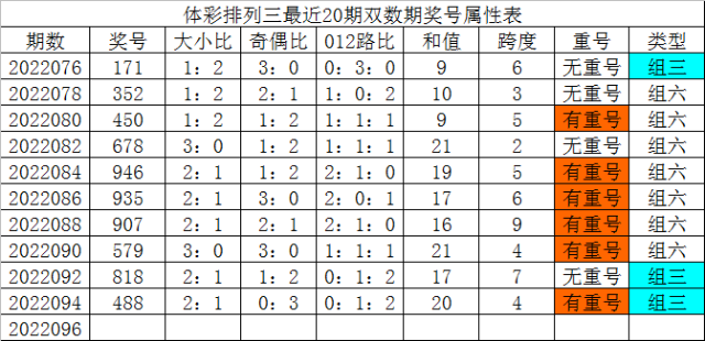 体彩排列三最近20期双数期奖号分别为:171、352、450、678、946、935、907、579、818、488,各期奖号详细属性下表: