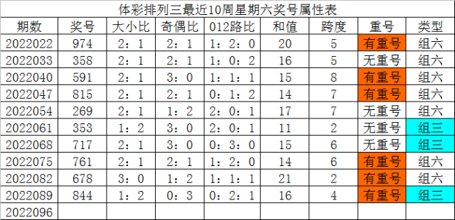 体彩排列三最近10周星期六奖号分别为:974、358、591、815、269、353、717、761、678、844,各奖号属性详见下表: