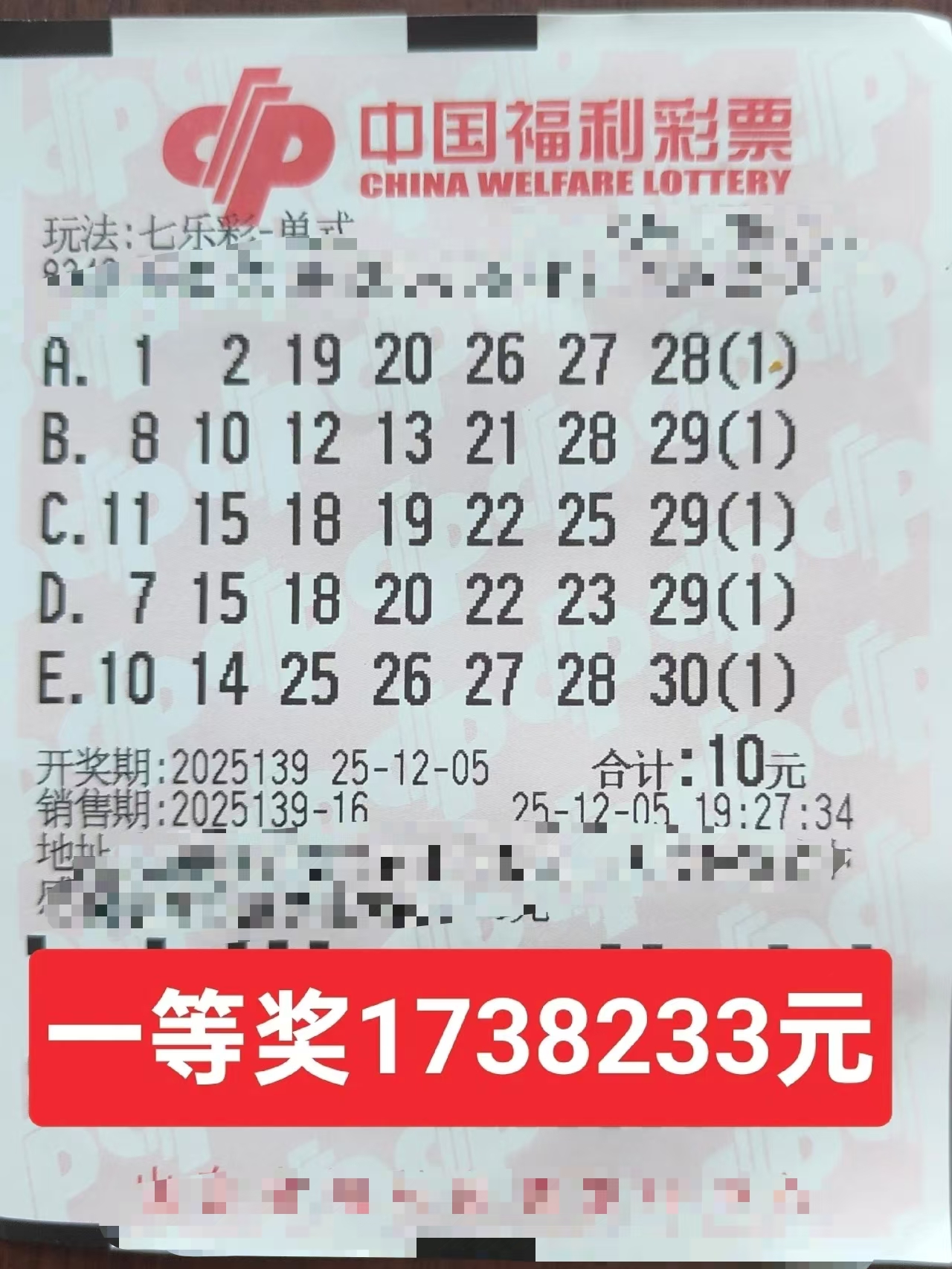 12月5日,七乐彩第2025139期开奖,泰安市泰山区xxxx投注站传来喜讯,一位幸运彩友凭借一张10元机选单式票,成功命中1注一等奖,喜获奖金173万元。当期开奖基本号码为03、08、15、18、21、28、30,特别号码05。