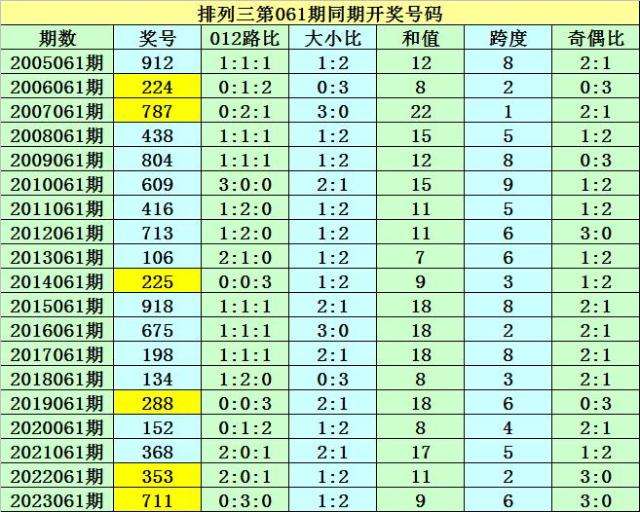 本期为排列三第2024061期开奖,开奖日期为:2024年3月11日,历史上排列三第061期已开出了19次奖号,历年同期开出号码分别为:912-224-787-438-804-609-416-713-106-225-918-675-198-134-288-152-368-353-711。