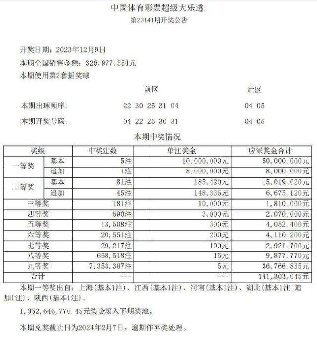北京时间12月9日晚,体彩大乐透第23141期开奖,当期开奖号码为前区04 22 25 30 31,后区04 05;本期大乐透全国销量为3。26亿元,计奖结束后奖池余额10。62亿元。