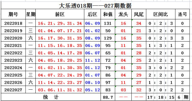 上期回顾,大乐透第2022027期开奖,本期奖号:前区03 06 11 31 32;后区05 12,当期前区号码大小比为2:3,三区比3:0:2,奇偶比为3:2。前区开出连号31 32,开出重号11。