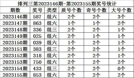上期回顾:排列三第2023155期开奖:853,质合比为2:1,奇偶比为2:1,大小比为2:1。