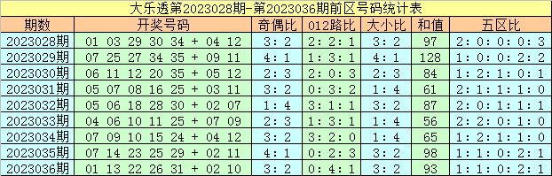 2、前区五区分析:最近9期前区五区比为13:9:4:10:9,上期奖号五区比为1:1:0:2:1,第四区大热,第三区断区,本期预计第一、四区号码大热,防第二、五区号码全部轮空,参考五区比2:0:1:2:0。