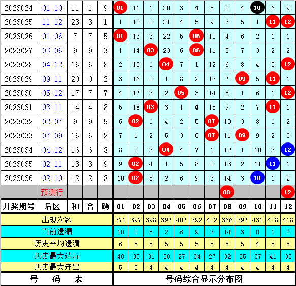 5、后区分析:上期后区奖号为:02和10,开出小大组合和偶偶组合,本期看好大号走热,预计偶数走热,参考两码08、12。