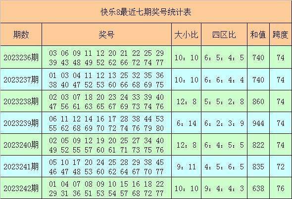福彩快乐8第2023242期开出奖号:01 04 07 08 09 10 15 16 18 22 29 31 36 51 53 54 57 68 72 77,其中奖号大小比为7:13,四区比为9:4:4:3,和值为638,跨度为76。