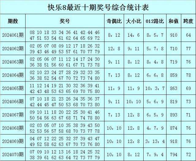 福彩快乐8第2024070期开出奖号:07 09 10 12 13 16 18 24 25 32 38 39 61 62 63 64 72 73 77 79,其中奖号奇偶比开出10:10,大小比开出8:12,和值开出794,跨度开出72,012路比开出7:9:4。