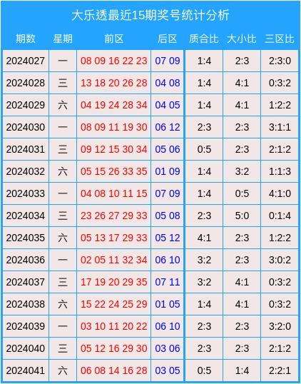 质合分析:近15期前区质合比为24:51,走势倾向合数。上期前区质合比为0:5,走势倾向合数。本期预测走势倾向合数,推荐前区质合比为2:3。