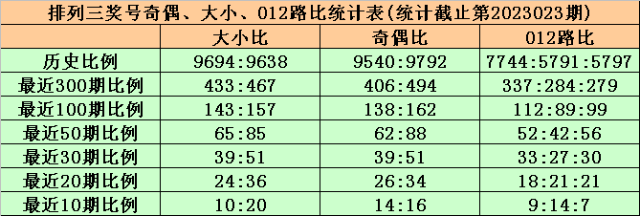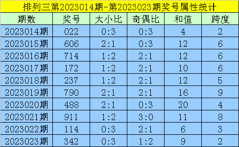 上期回顾:排列三第2023023期出现奖号342。开出组六,奇偶比1:2,012路比1:1:1,大小比0:3,和值9,跨度2。