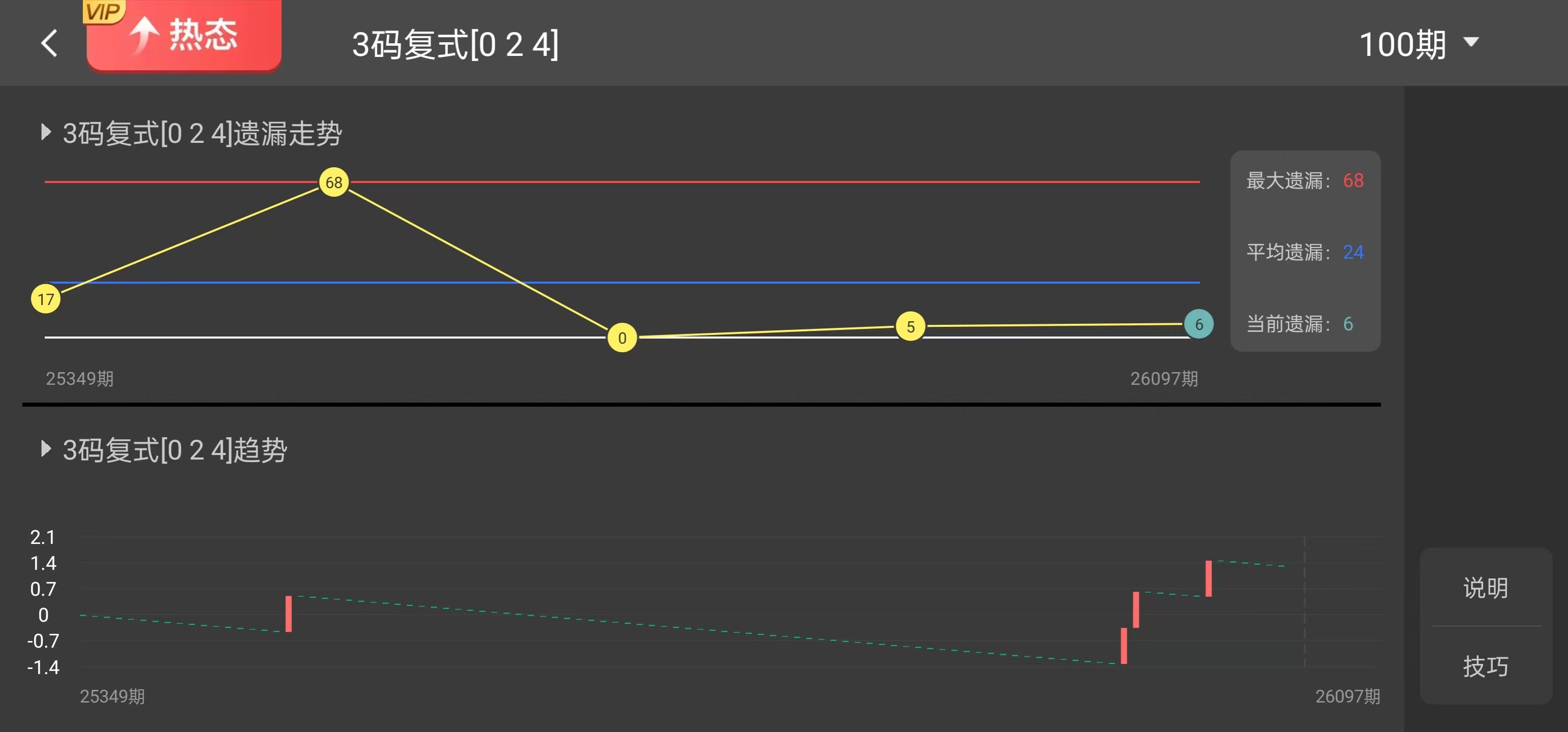 跨度走向近 3 期连续开出中低跨度,整体偏离近 9 期跨度均值,下期跨度大概率向中高跨度区间回升,呈现走高的走向,低跨度连续开出的概率偏低,整体向 5-7 的中高跨度区间靠拢。