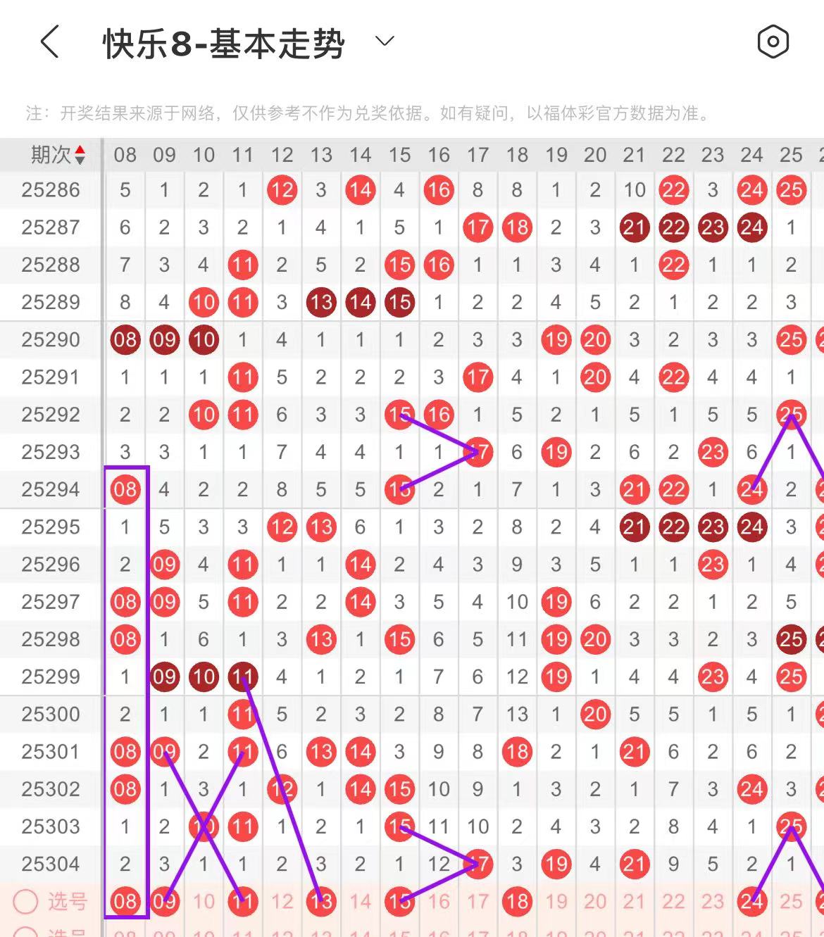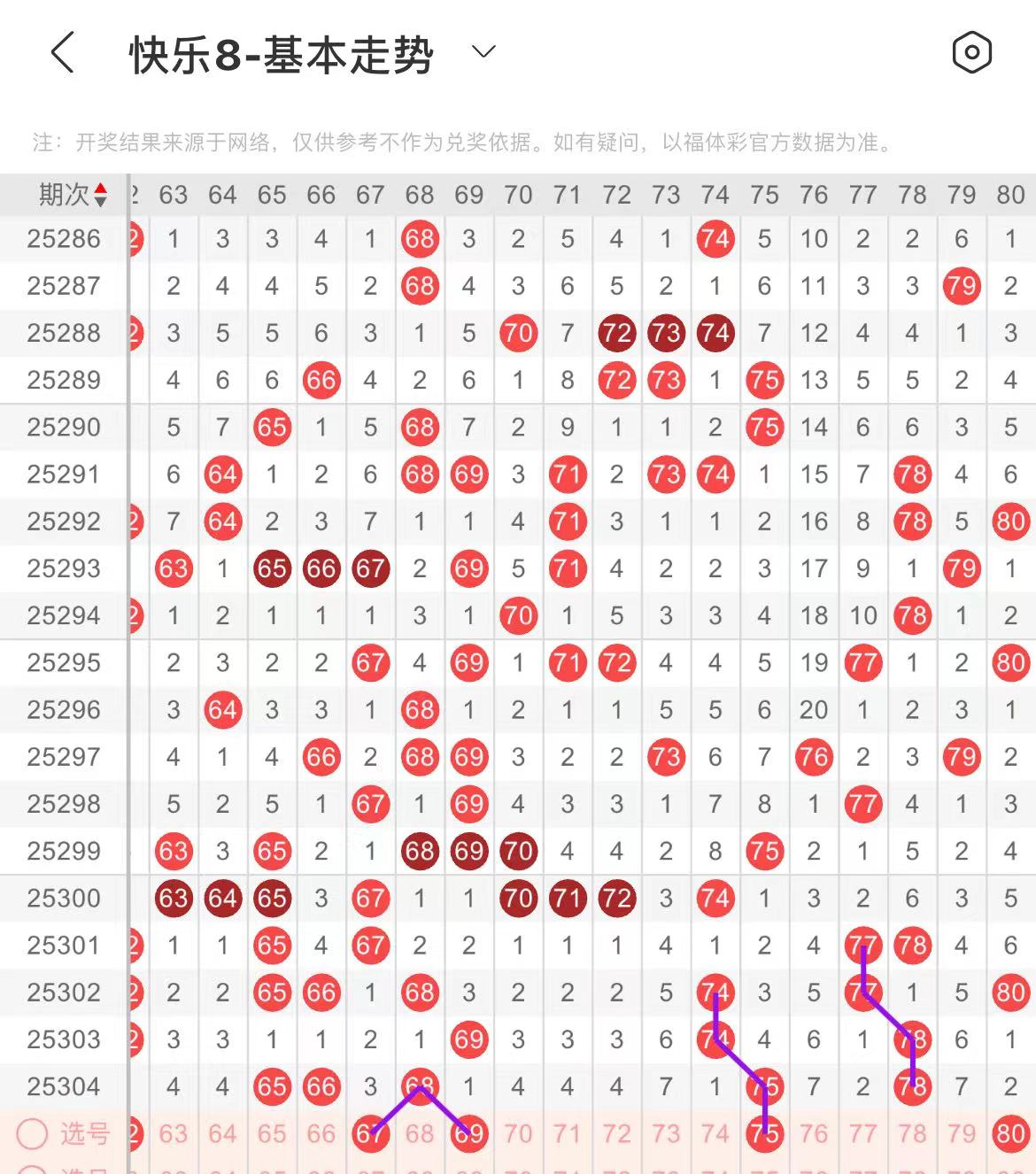 71-80区:本区间上期开出了两个号码,从号码走势图上看,该区现属于温号区,出号个数应该能保持在两个号码左右。本期有出号走势的号码有75号,走重,复制78号走势形态出号,80号,78对应80出号走势。