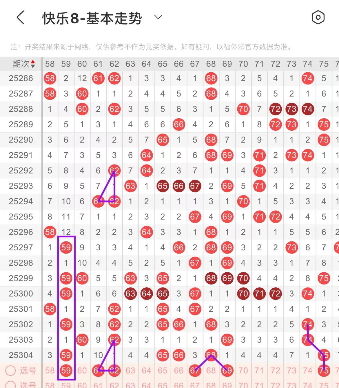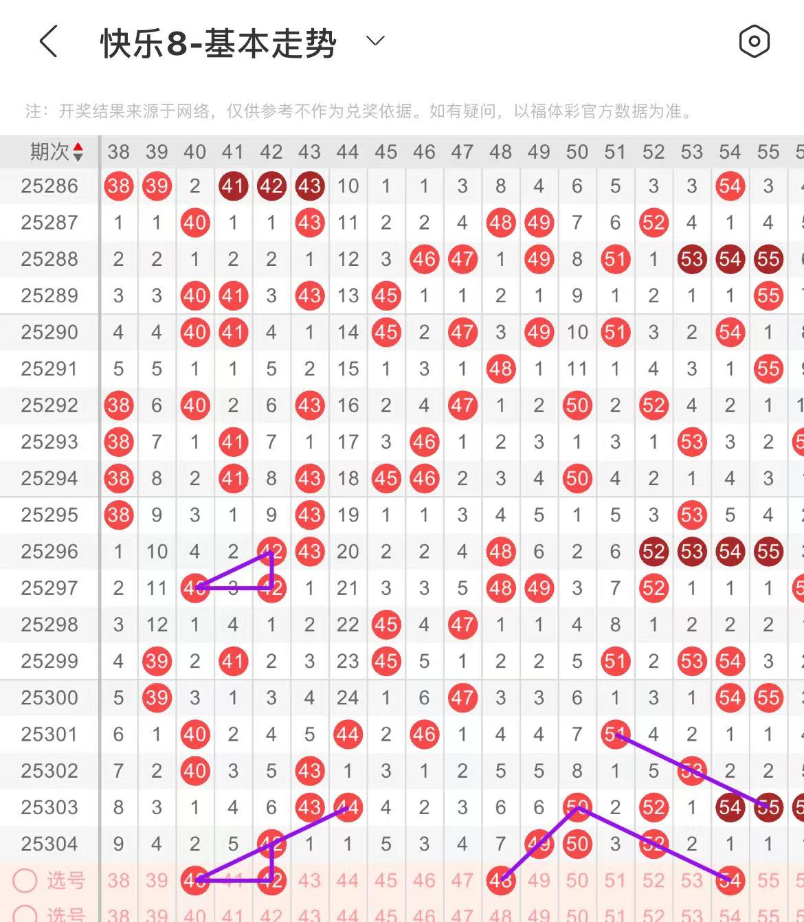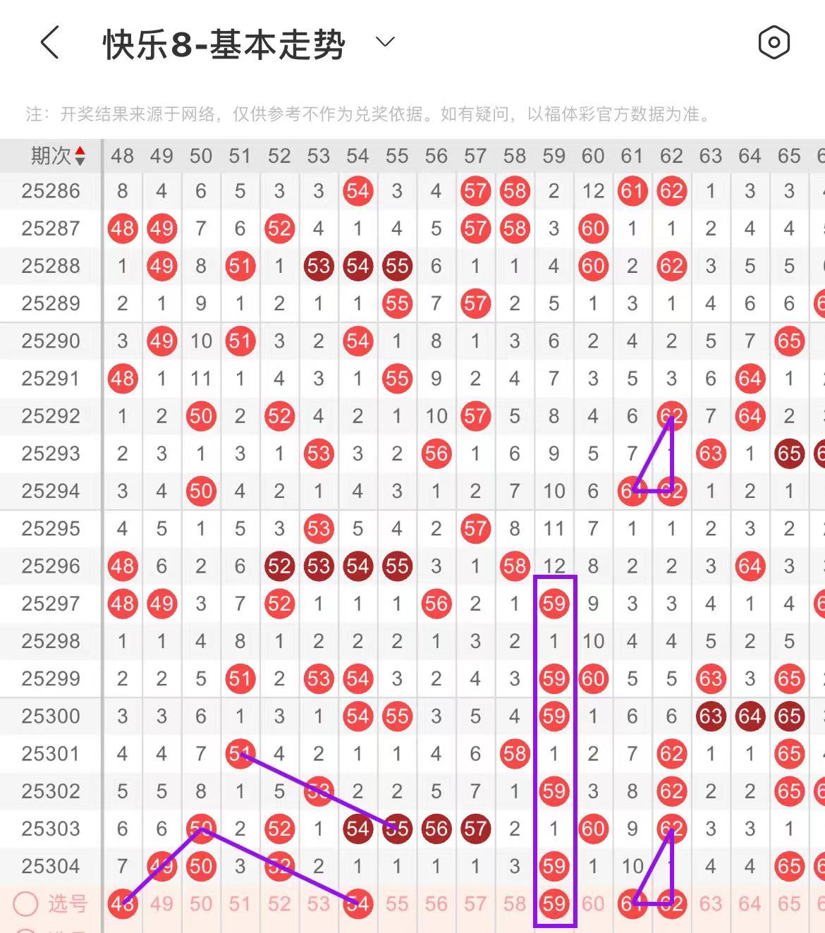 51-60区:本区间上期开出了两个号码,从号码走势图上看,该区现属于温热区,本期出号个数在两个号码左右。本期有出号走势的号码有54号,平行斜连出号走势,59号,形态相同出号走势。