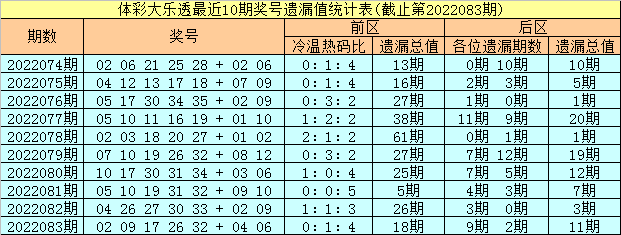 上期回顾:体彩大乐透第2022083期奖号为:02 09 17 26 32 + 04 06,前区奖号冷温热码比为0:1:4,遗漏总值为18期,后区奖号遗漏总值为11期。