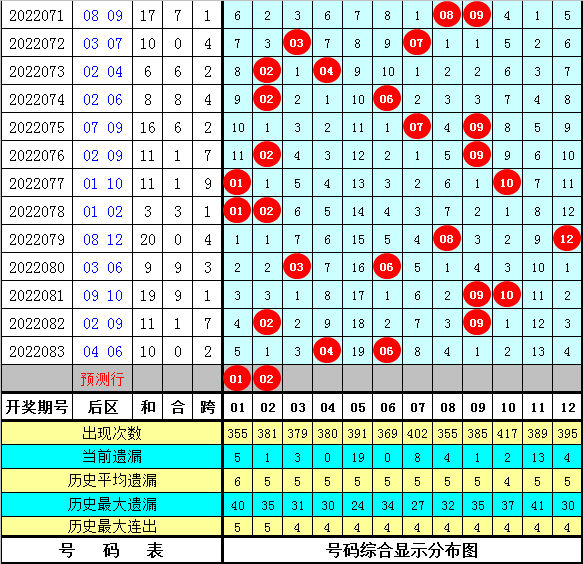 后区奖号分析:上期后区开出奖号04+06,最近100期后区冷温热码个数比为32:62:106,前50期后区冷温热码个数比为15:31:54,最近10期后区冷温热码个数比为3:6:11,目前后区含有冷温热码个数比为2:4:6,本期后区号码大范围参考:01、02、08、09、10,单挑两码01、02。