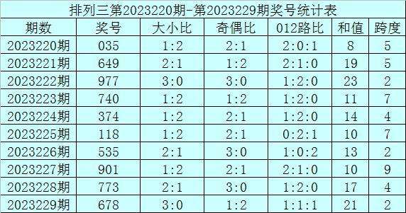 上期回顾:排列三第2023229期奖号为678,奖号012路比为1:1:1,奇偶比为1:2,大小比为3:0,和值为21,跨度为2。