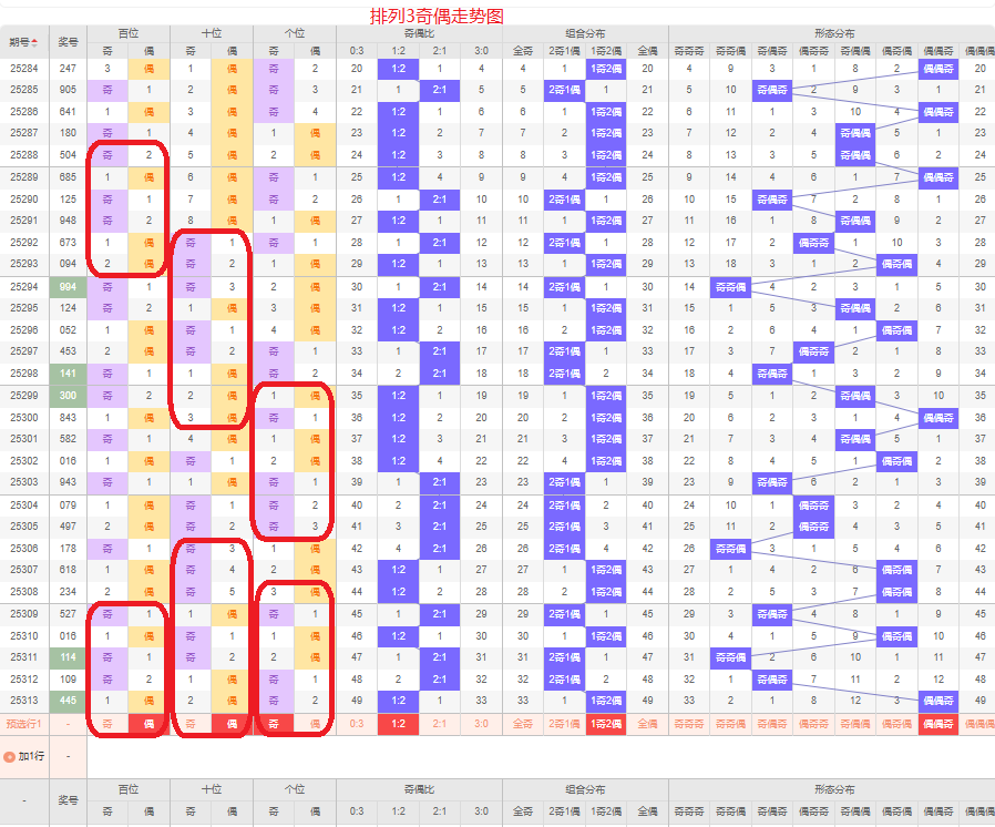 上一期的奇偶比为1:2,两偶的号码组合,从近五期的奇偶数出现情况看,奇数出8次,偶数出现7次,奇数偶数号码出现较平均,本期要侧重两偶的号码组合,侧重偶偶奇或奇奇奇的号码组合,根据奇偶组合形态可做五码定位02468/02468/13579或13579/13579/13579