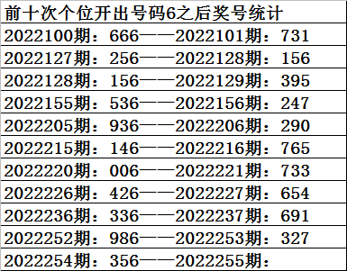 四、个位分析:上期开出号码6,前10次号码6出现之后下期同位号码为:1657053417,其中号码大小比为5:5,相等;奇偶比为7:3,奇数号码走势较热;012路比为3:5:2,0路号码走温。本期参考号码:3。