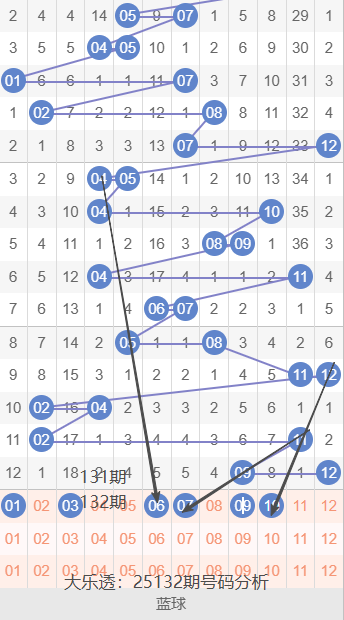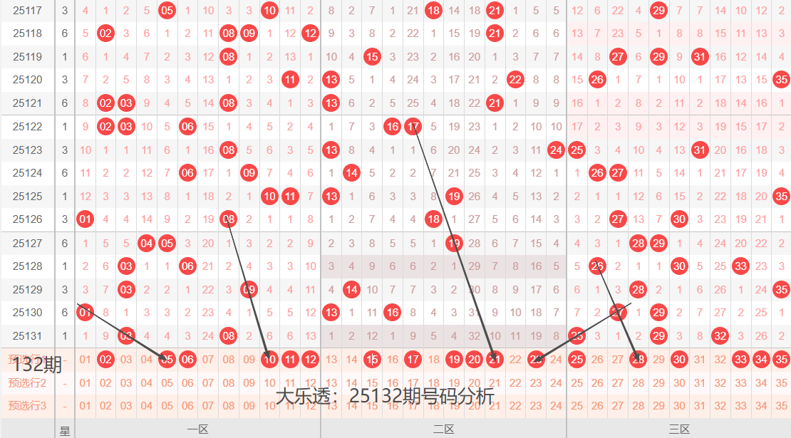 通过上期号码的简单分析,我们看下25132期红色号码球的总体走势,如下图: