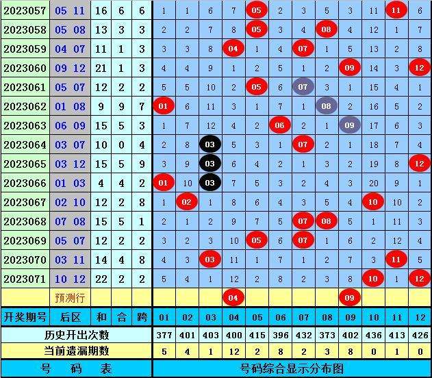 后区分析:最近30期后区奖号012路比为18:21:21,最近10期后区奖号012路比为8:7:5,上期后区为1路+0路组合10和12,本期后区参考号码04、09、10、11、12,继续关注0路号码和1路号码,两码关注04、09。