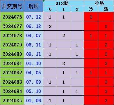 上期后区开出奖号01 06,近10期012路比7:9:4,1路号码较热,0路号码较温,2路号码较冷,0路参考号码“06 12”,1路参考号码“04”,2路参考号码“08 11”,近10期冷热比4:16,热码形式较好,综合分析,精选号码11 12。