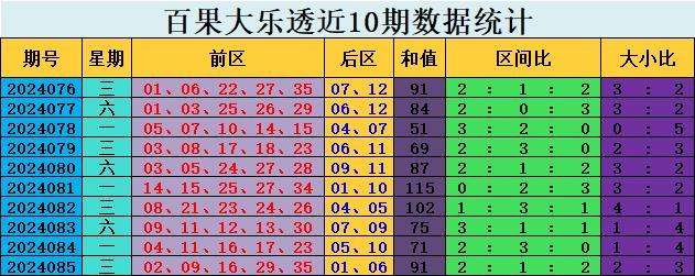 和值分析:上期开出奖号和值91,近10期和值平均值83。6,近10期超过平均值有6次,预测本期开出奖号和值与近10期和值平均值相比呈现上升趋势,本期推荐和值76。