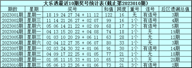 开奖回顾:大乐透第23010期开出奖号:05、06、13、23、26+01 06。其中前区和值为73,跨度为21,包含3个重号,开出连号组合,后区奖号遗漏总值为2期。