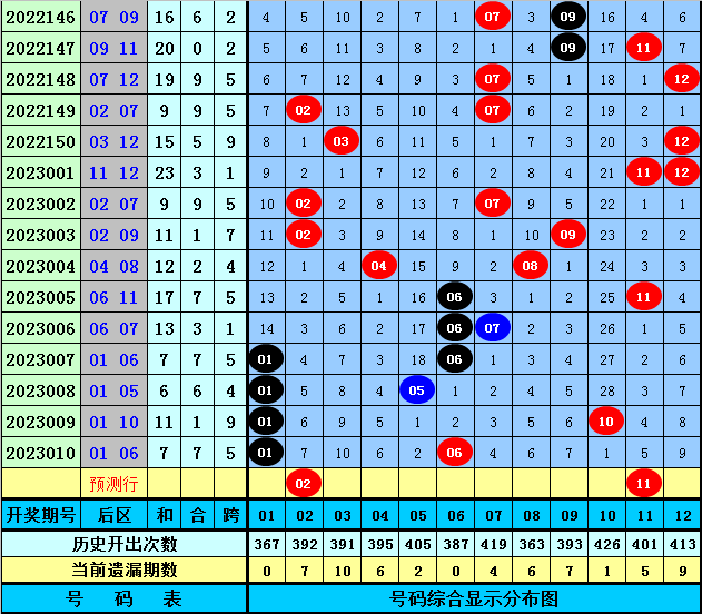 后区分析(热码遗漏0-6期,温码遗漏7-15期,冷码遗漏15期以上):上期后区开出号码01和06,分别遗漏0期和2期,最近10期后区奖号遗漏总期数分别为:3期、4期、5期、19期、12期、3期、14期、18期、28期、2期,本期后区号码大范围参考01、02、07、08、11,精选两码02、11。