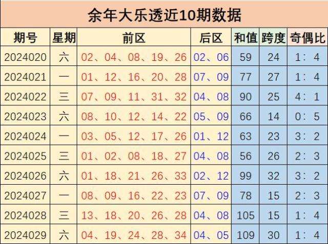 大乐透第2024029期出奖号统计:前区04 19 24 28 34,后区04、05,和值为109,跨度30,龙头04凤尾34,三区比为1:2:2,012路比为1:4:0,奇偶比为1:4,大小比为4:1,冷热比为4:1,1枚重号,0组连号。